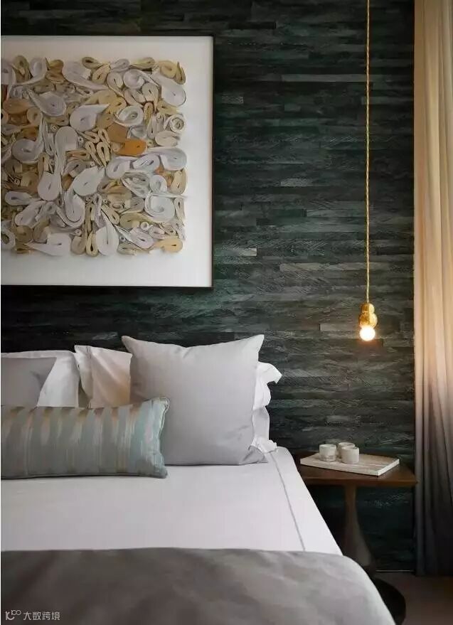 次卧贯彻木的主题元素,墙壁用灰绿色的横木纹墙纸装饰,挂上一幅充满木元素的艺术挂画,一盏细小的金属灯泡自天花落下,让整个房间生气盎然。