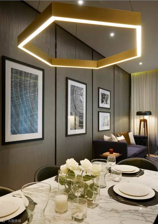 餐厅摆放白色云石六人长餐桌,搭配六把深啡色真皮餐椅,上方有一盏六角环形金属吊灯,营造出时尚典雅的用餐氛围。一旁的厨房为开放式设计,木饰面墙身和洁白的橱柜一字排开,功能齐备,满足户主每天生活所需。这里也有一个三角形露台,可以饱览吉隆坡市内景色。