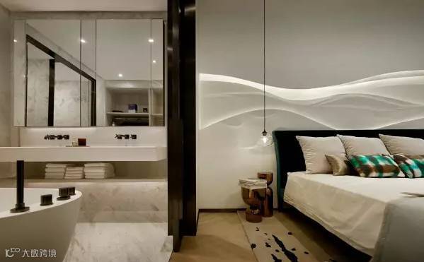 主人套房延续整体设计风格,同样铺浅木色地板,床头墙上柔和的白色浪纹设计首先抓住视觉焦点,配合黑色水墨纹地毯点出主题,让人仿佛置身海洋之中。两盏细小的球形透明吊灯和玫瑰金床头几造型别致,为房间轻轻点缀时尚元素。