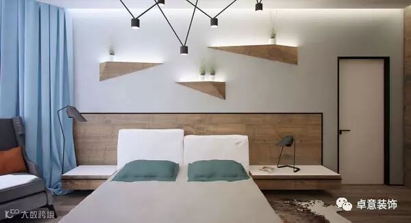 墙面上则以立体切面的木质搁架来作为收纳架