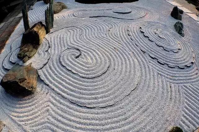 虽然日式园林善于掩饰人工,但也善于利用各种元素创造出丰富的感觉,日本庭院中多用一种叫“白川砂”的砂粒,拥有乳白色的色泽和轻盈的质感。细砂虽小,气质独具 ,也是给人“纯、静“的关键要素。特别是对于勾勒砂粒的平庭枯山水来说,白砂既是铺底,又是结构体系。日本庭院中的白砂具有功能性。在枯山水之外的庭园如修学院离宫、桂离宫、京都御苑、仙洞御所、西芳寺等名庭乃至皇居、二条城等场所均大量使用白砂铺地,既表达美观素雅的景观效果,又兼具保护地表一使之不受霜冻、尘土不扬的实用性作用。