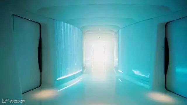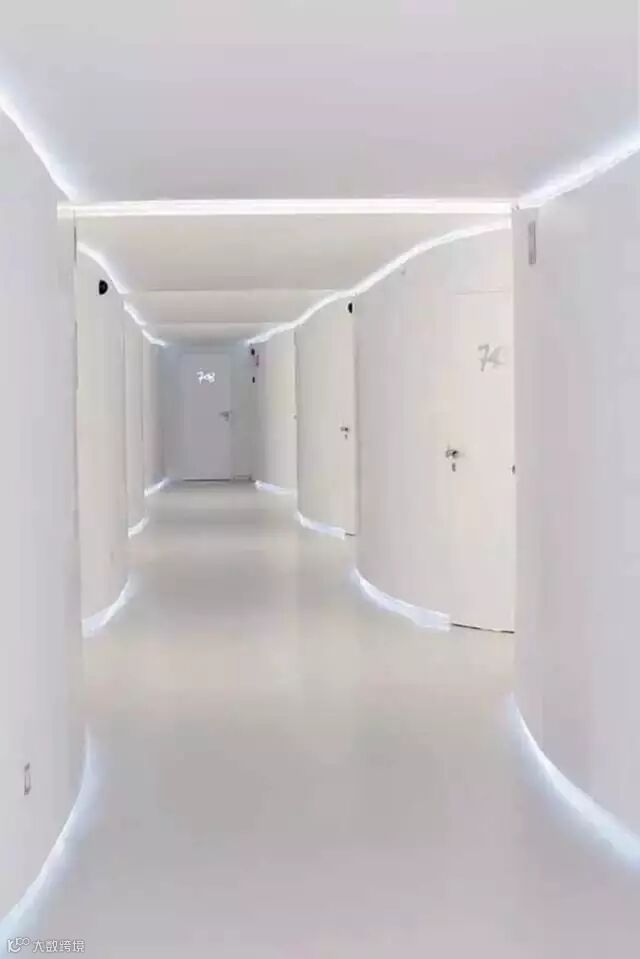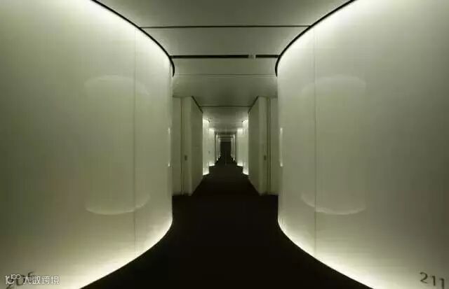 走廊两边的墙面就像一个个巨型背光式半透明玻璃灯笼,