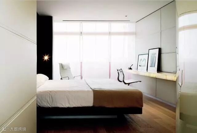 床的四周包着皮革,同样的材质也用在了床头板和床头架上。地上铺镶了涂油橡木地板,为室内带来一些自然暖意。