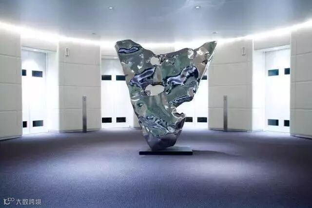 走入二层的大堂,最先迎接客人的是中国艺术家展望的雕塑。四周墙面包裹了米白色皮革,为客人营造出一种私密感。