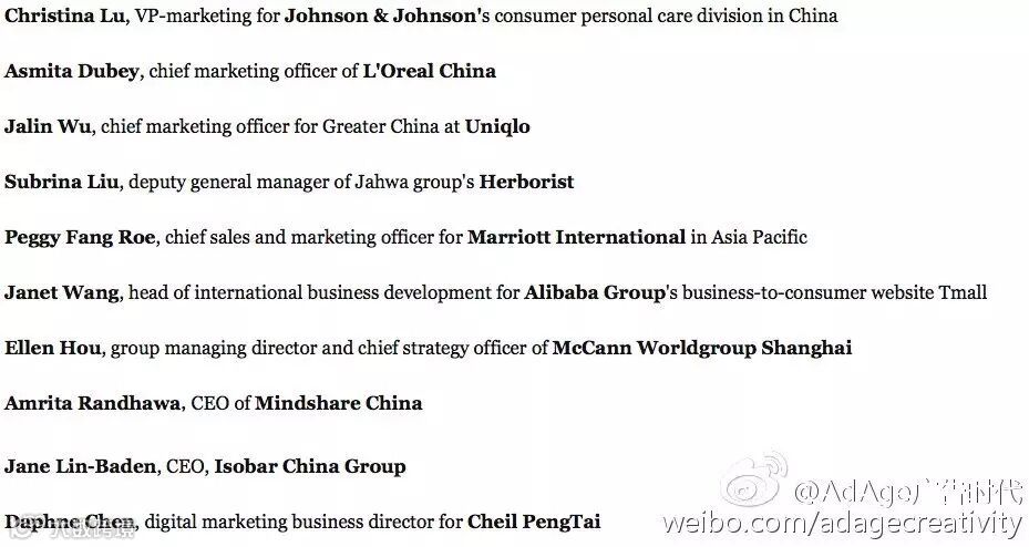 全球最具影响力的广告杂志《广告时代》(Advertising Age) 日前揭晓了2015年最中国“最值得瞩目女性(Women to Watch)”榜单。