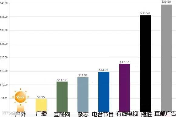 按往年数据显示,广告商在户外广告上的总体花费,在广播、网站、杂志、报纸、直邮广告与电视广告等各类营销方式中最为低廉。