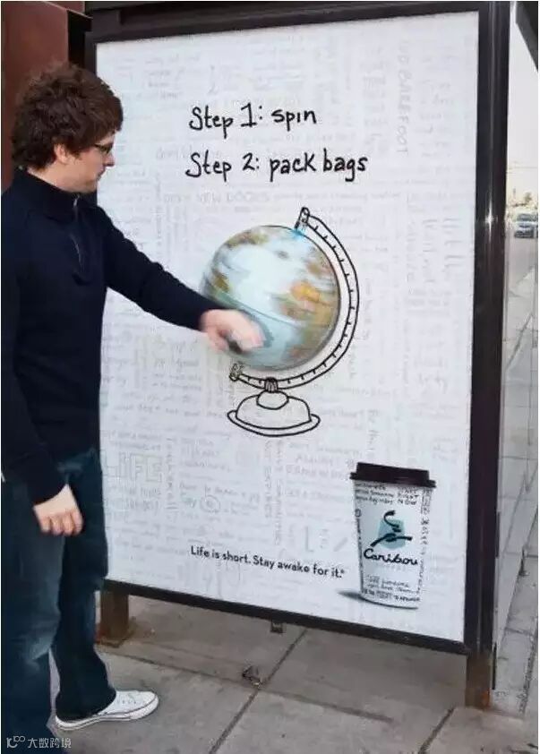 Caribou曾利用户外电子屏为受众快递咖啡:转动屏幕上的地球仪,找到此刻自己的所在位置,输入送咖啡的地址,就会有一杯香浓咖啡送达。
