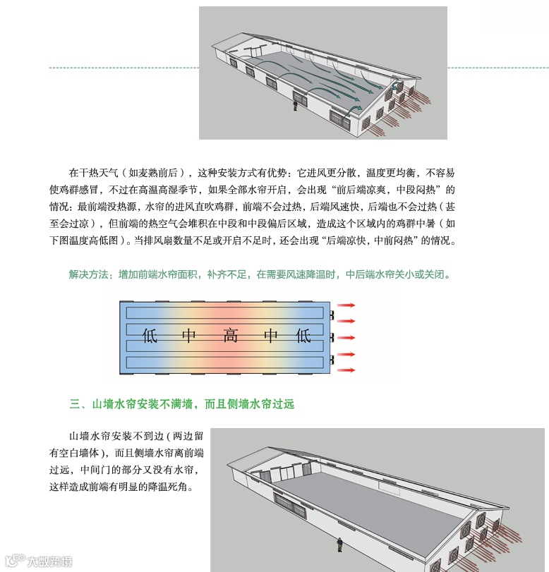 注意:高温高湿季节,两段式水帘安装方式,负压不可过低,当我们发现山墙水帘与侧墙水帘之间闷热时,很可能存在负压过低或是通风短路的问题。