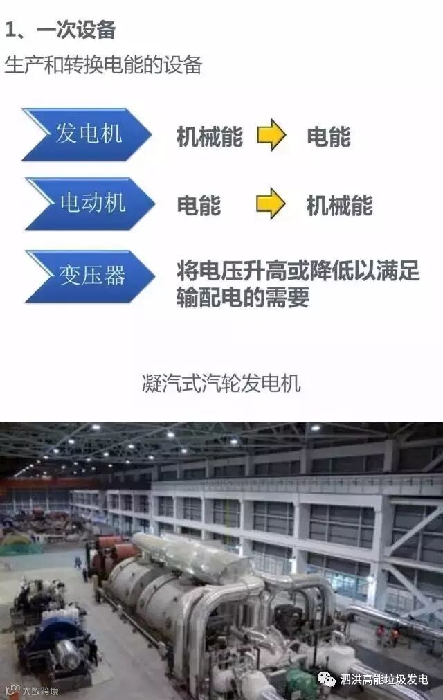 1)发电机:与汽轮机同轴,将汽轮机传递的机械能转换为电能。由定子和转子组成,转子同汽轮机转轴连接,转子线圈通入直流电源,动静结合处的电流通过碳刷传递,转子旋转后形成旋转磁场。定子切割转子旋转磁场,感应出三相交流电势。发电机线圈为Y型接法,中性点和出线均从机腹下引出。