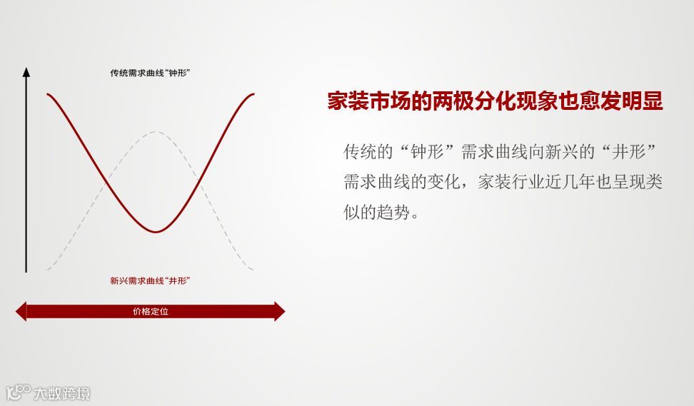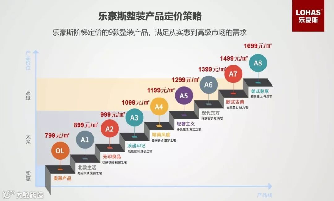 这几年,市场发生了急剧的变化,从传统的“钟形”需求曲线向新兴的“井形”需求曲线的变化,低端和高端客户都在同时增长,而中端客户越来越少,这是目前的市场形式。以前乐豪斯的定位是中级市场,今年我们的品牌定位要向两端延伸,覆盖了更多的客户群体。针对现在市场形式变化,我们的应对策略分为三个方向,一是阶梯定价,价格分层推动消费者向高价位移动;二是品牌下沉,举高打低,利用自身品牌及产品优势,挤占更多实惠市场;三是制造冲突,错位打击,利用独特价值,重新细分、聚焦高级市场用户,抢夺高级市场份额。结合“井形”需求曲线,今年我们的整装产品重新做了定位,产品线及定价策略为由实惠、大众、高级“逐级而上”形式分布。这种定价策略能使消费者产生货真价实、按质论价的感觉,因而容易被消费者所接受。阶梯定价涵盖了我们今年新推出的奥莱产品,这款产品是面向刚需客户,加上A1-A8的产品,总共九款产品涵盖了实惠、大众、高级三个市场,这也是目前行业内唯一能提供9款产品选择的公司。