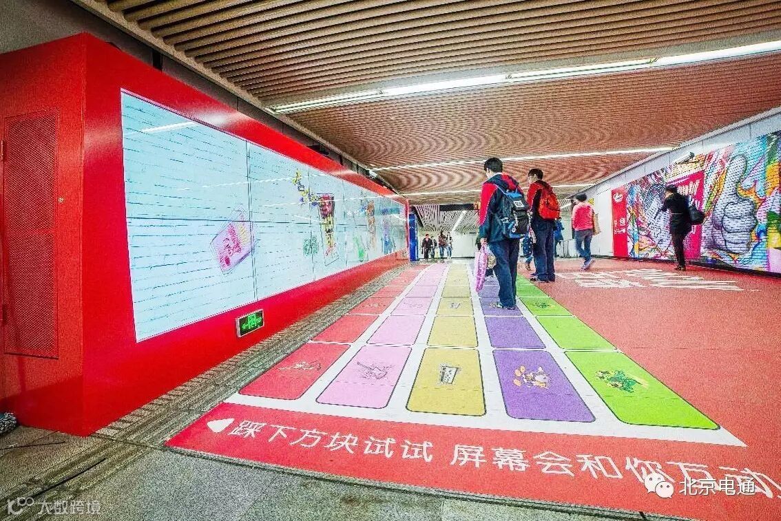 将感应器与电脑连接,设置成五种乐器的声音,如吉他、贝司、钢琴等,由五种颜色的地板区分。当过路人踩到不同颜色地板上的感应器,随之响起不同乐器的声音,人数越多演奏的乐器种类越多,通过与周围人群的互动,共同演奏独特的交响乐。