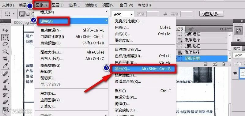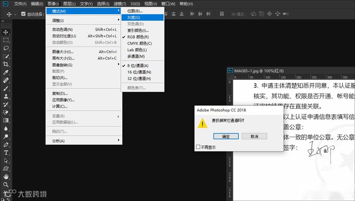 推荐操作:点击“图像”>"模式">“灰度”,在弹出来的对话框点击“确定”扔掉其它通道,这样我们就把这个图片变成黑白的了
