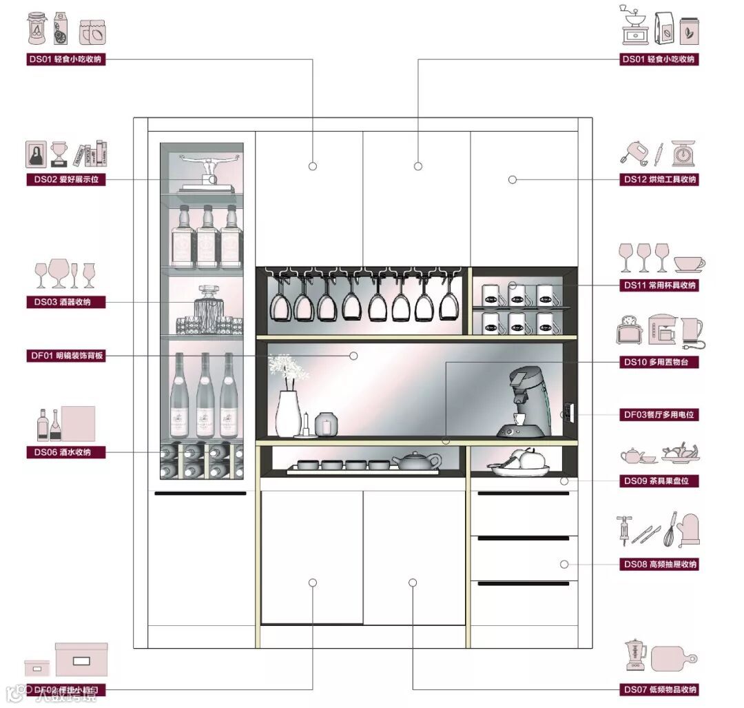 餐边柜是餐厅区域解决收纳难题的重要存在,也是餐桌的延伸,当亲朋好友在一起畅饮,可以放置餐桌容纳不下的醒酒器、菜品等;同时餐边柜还可以是饮品制作区、烘焙区,轻松的周末,给家人带来一份完美的下午茶;餐边柜可以收纳不常用餐具,减轻小户型厨房收纳的不足。