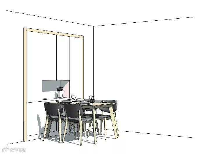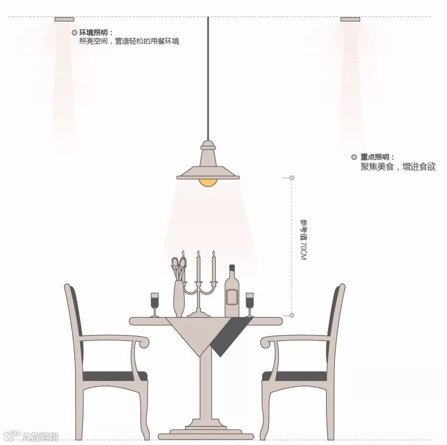 需要设置均匀分布的顶棚嵌灯,或者加一盏落地灯作为环境照明,增加漫反射的照明,将灯光做出层次,形成一个光线柔和、温馨的就餐空间。
