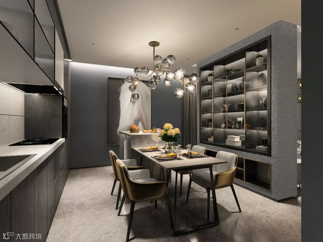 餐厨一体化:将开放式厨房与餐厅相联通,可以制造视觉上更开阔的空间,可以一边做饭一边和家人互动。传菜、在冰箱取冷饮更方便,便捷高效。