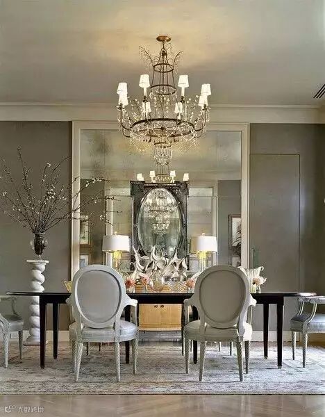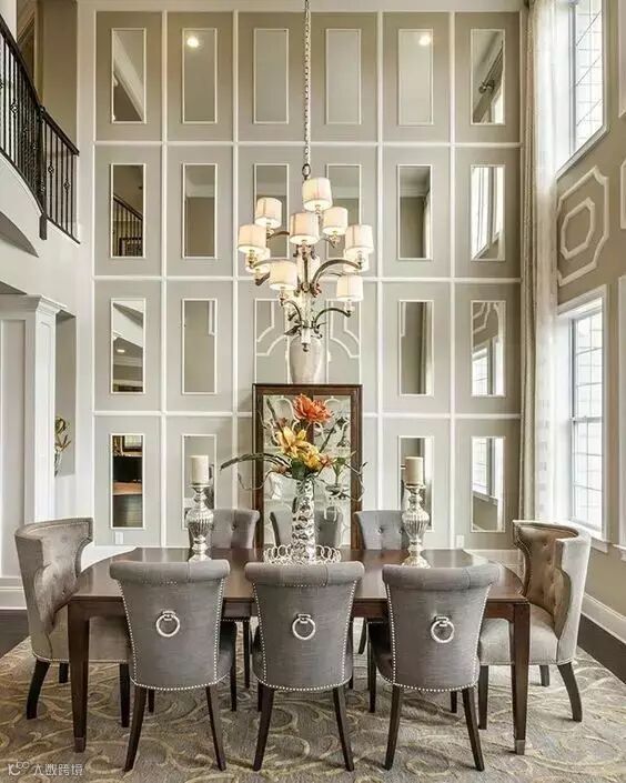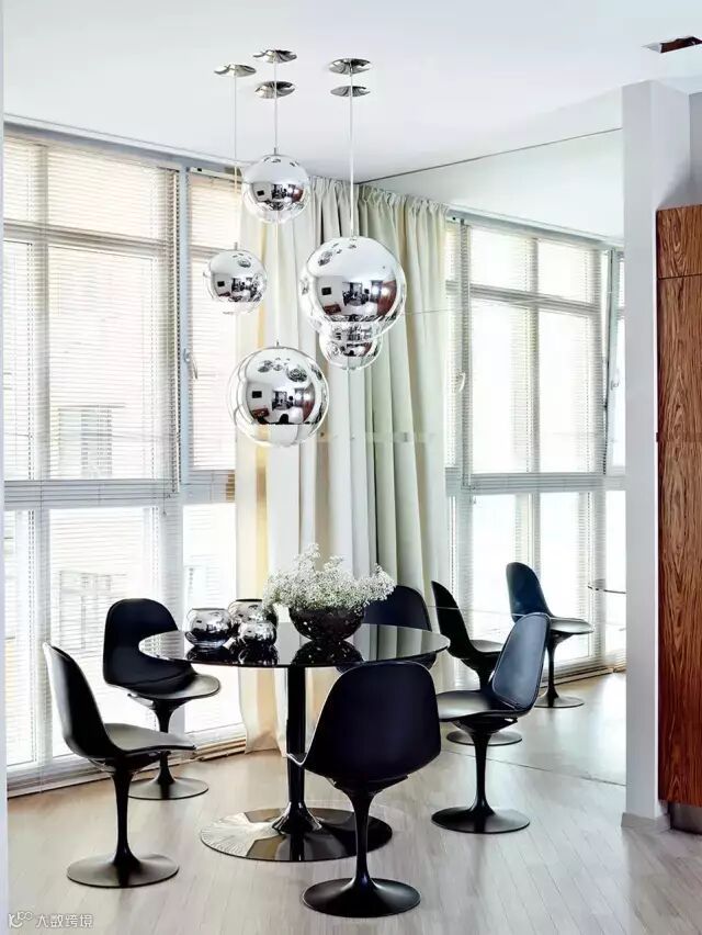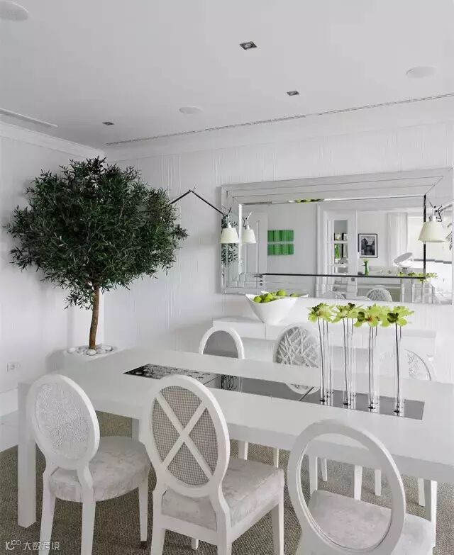 餐桌在空间的尽头,与餐桌平行的一块镜面,