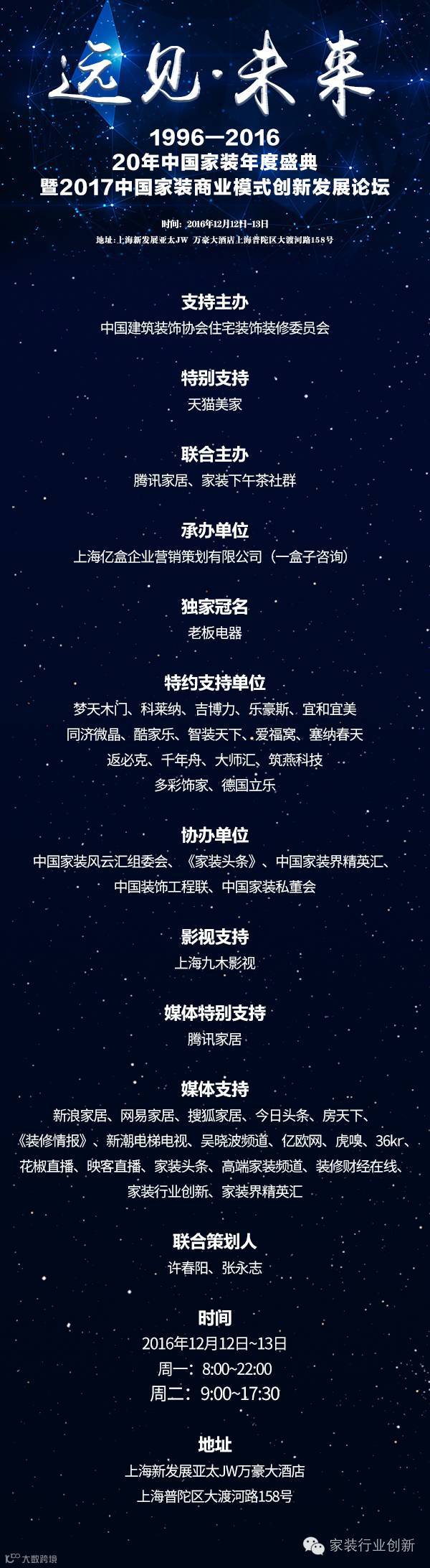 这可能是家装行业第一次邀请纯粹BOSS和管理精英的大型盛典,现场近700位与会嘉宾全部是企业决策层,这几乎就是整个主流家装圈。现场还将发布2016年中国家装风云榜榜单,参与双十二盛会,一次将建立全国高端人脉网络。