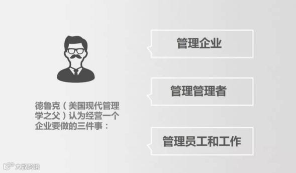 德鲁克(美国现代管理学之父)认为是三件事:管理企业、管理管理者、管理员工和工作。