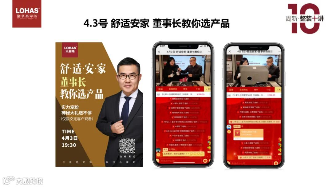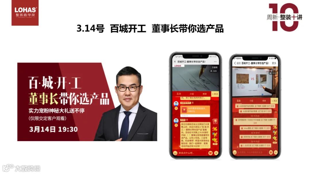 转化直播是只针对收订客户的专场直播,帮助加盟商小伙伴进行转化。举个例子,3.6日微信爆破直播结束后一周后,也就是3.14日我们进行了“百城开工董事长带你选产品”的转化直播;3.28微信爆破直播结束后,我们也在4.3日进行了另一场转化直播。在直播当中我也将乐豪斯的产品、单品、研发理念,性能数据、与品牌公司的对比、基础装修的工艺工法、等每一项都详细的介绍个客户,让客户未到店也已经对乐豪斯的产品非常了解,对乐豪斯的品牌非常信任。而且董事长亲自示范讲解,带来的信任感权威感也要比店内销售及设计师的好得多。销售及设计师更多得是起到督促作用,提醒客户抓紧转化。整个过程都起到了促进转化的作用。