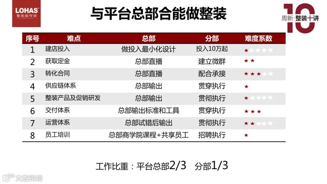 最后我再次强调,做整装有八大难点,我们也对这些难点做了评估,最后总结的结果,我们总部可以帮忙承接2/3的工作难题,作为加盟商只需解决1/3,让做整装不再是一件非常困难的事情。乐豪斯让天下没有难做的整装,这也是我们一直奉承的理念。