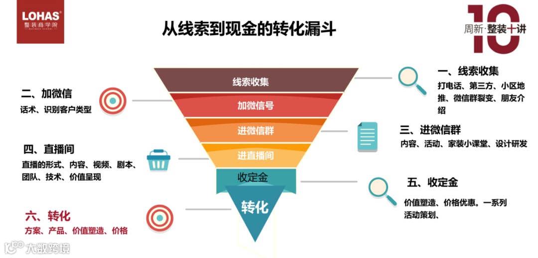 上一讲我讲到如何通过直播进行收订的过程,从线索到现金的转化漏斗,从第一步的线索收集到第五步的收定金,那么本讲我就来讲一下第五步到第六步也就是收定金到转化的一个步骤。