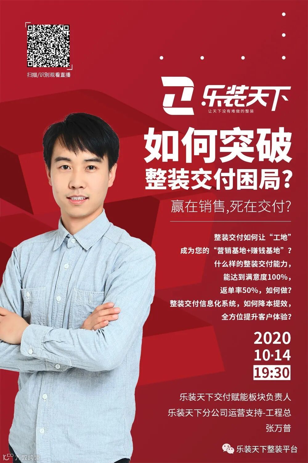 为了避免赢在销售,死在交付,让工地成为营销基地+赚钱基地,通过交付信息化系统,让客户满意度100% 返单率50%,今天10月14日晚上19:30,乐装天下交付赋能负责人&乐装天下分公司运营支持-工程总张万普先生将为大家传授如何突破整装交付困局?
