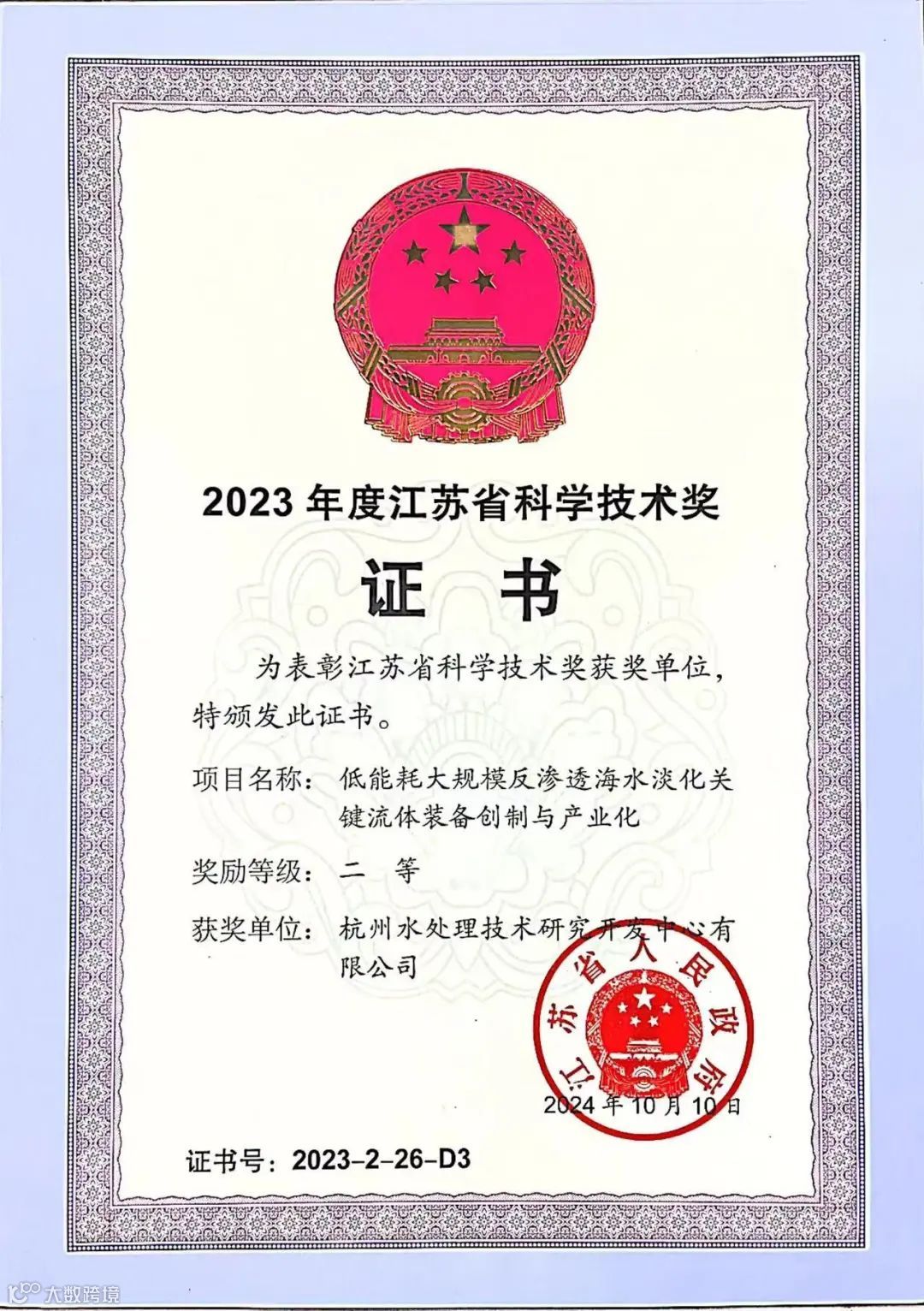 砥砺深耕,笃行致远。近来,杭州水处理科技创新频结硕果,再次传来喜讯——由江苏大学牵头,杭州水处理技术研究开发中心有限公司等单位共同完成的“低能耗大规模反渗透海水淡化关键流体装备创制与产业化”项目荣获江苏省2023年度科技进步二等奖。