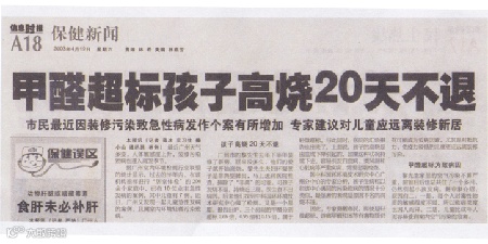 宋先生是海珠区某派出所的年轻警察,今年初突然患上白血病,现治疗费已花去50多万元。宋先生和家人都怀疑此病是单位集体宿舍的木床诱发的。宋先生所住的房间共有8张床,是几年前从某家私城购买的,直到现在仍有刺激性的异味。经检测这间宿舍的室内空气中甲醛和苯的含量严重超标。