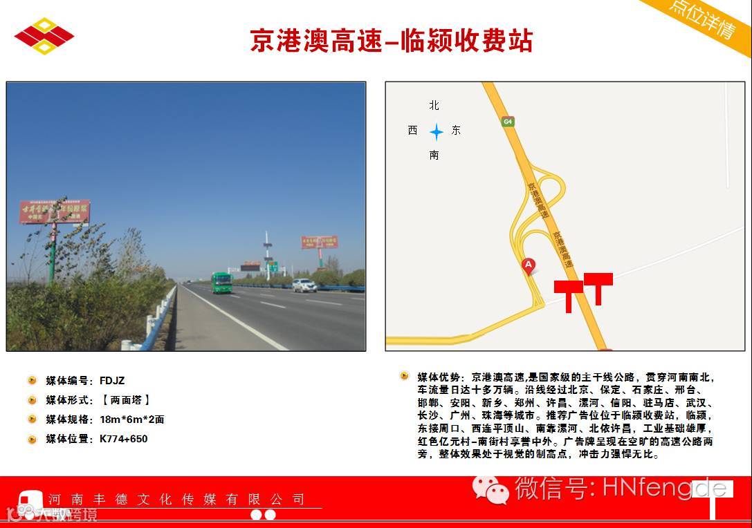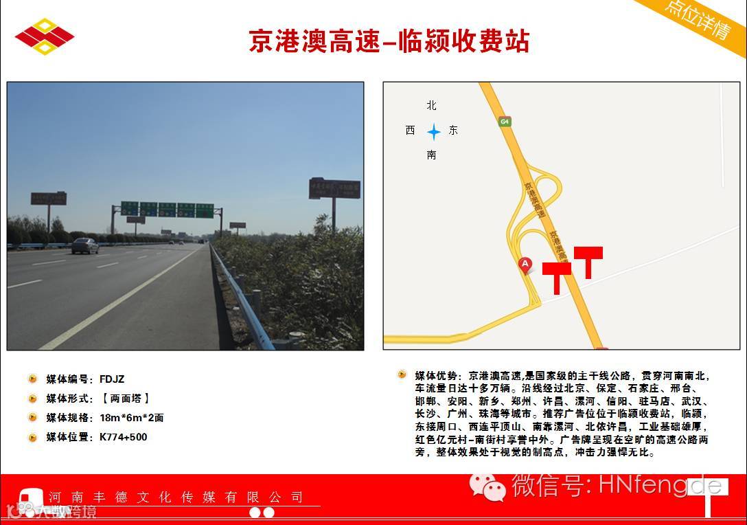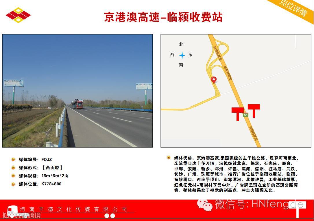 京港澳高速,是国家级的主干线公路,贯穿河南南北,车流量日达十多万辆。沿线经过北京、保定、石家庄、邢台、邯郸、安阳、新乡、郑州、许昌、漯河、信阳、驻马店、武汉、长沙、广州、珠海等城市。推荐广告位位于临颍收费站,临颍,东接周口、西连平顶山、南靠漯河、北依许昌,工业基础雄厚,红色亿元村-南街村享誉中外。广告牌呈现在空旷的高速公路两旁,整体效果处于视觉的制高点,冲击力强悍无比!