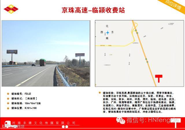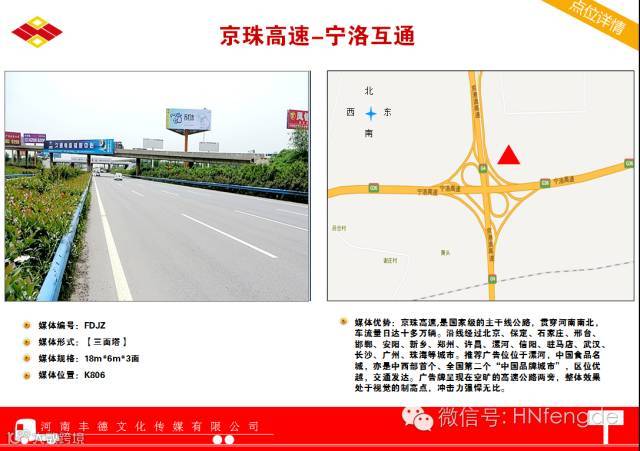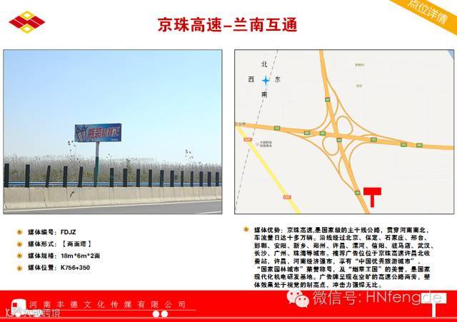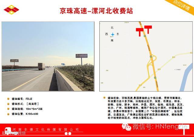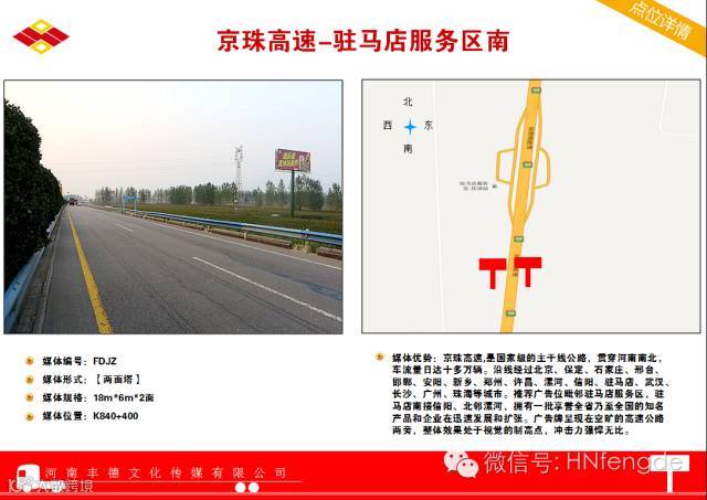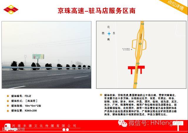 京港澳高速:北京至香港澳门高速公路简称京港澳高速公路(代号:G4),大体为原京珠高速公路,是一条首都放射型国家高速,是连接北京和广州、珠海、香港、澳门等南部重要城市的高速公路,为中国的南北交通大动脉, 全长约2285公里。是国家级的主干线公路,贯穿河南南北,车流量日达十多万辆。沿线经过北京、保定、石家庄、邢台、邯郸、安阳、新乡、郑州、许昌、漯河、信阳、驻马店、武汉、长沙、广州、珠海等城市。广告牌呈现在空旷的高速公路两旁,整体效果处于视觉的制高点,冲击力强悍无比。