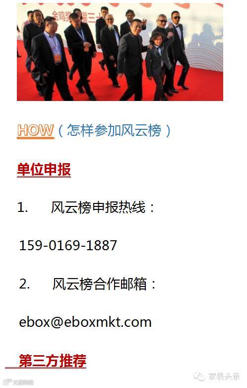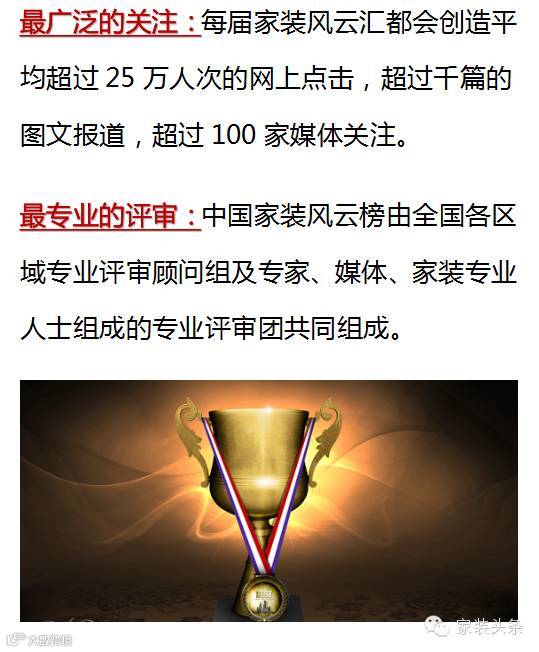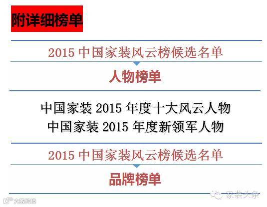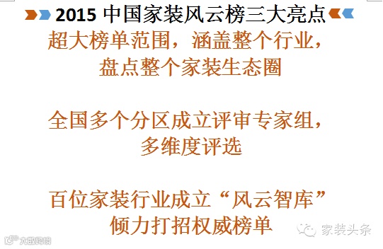 “2015中国家装风云榜”是由家装风云汇组委会、上海亿盒营销策划有限公司发起主办,由中国建筑装饰协会住宅装饰装修分会支持主办,联合全国家装行业协会,共同推出的中国家装行业年度成果大检阅。