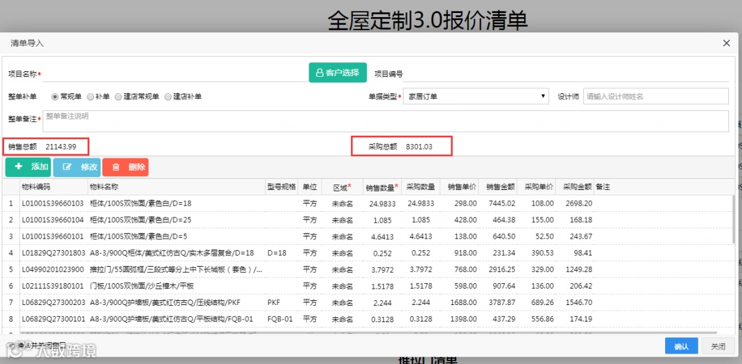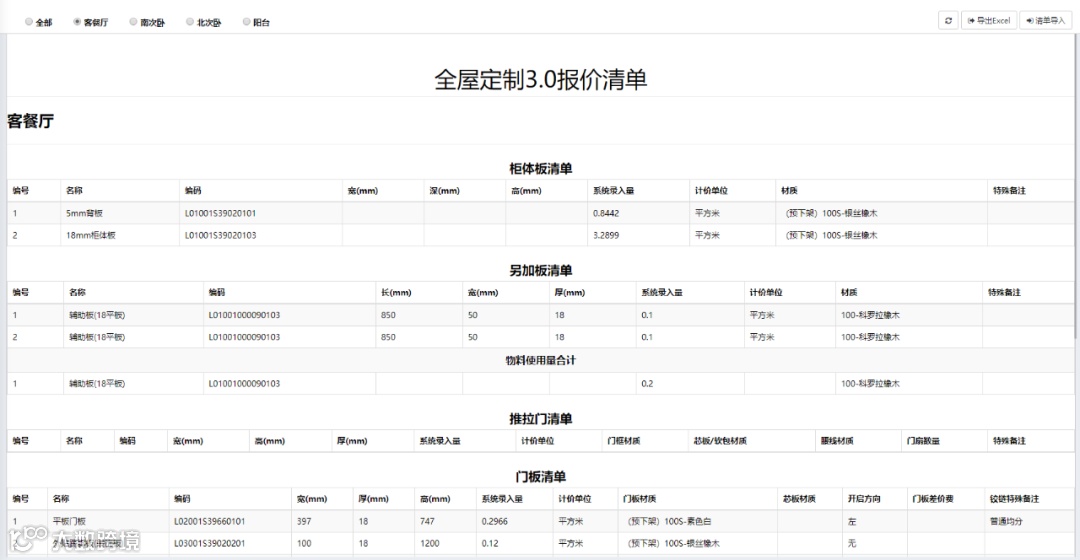 清单导入系统中即可生成准确的会员价和结算价,避免手工计算产生少报漏报问题。节省设计师录入物料时间。