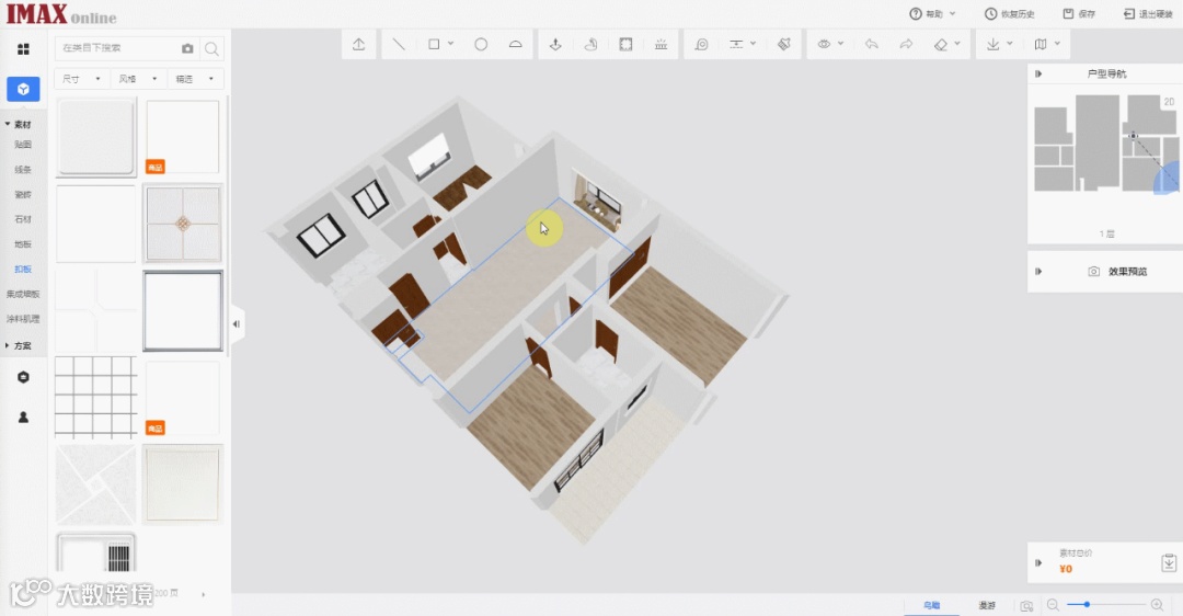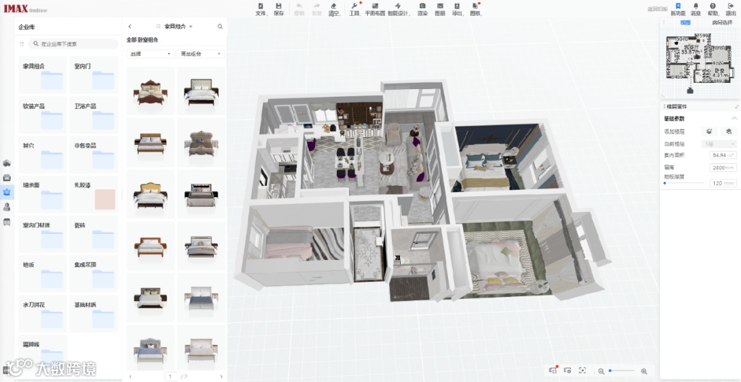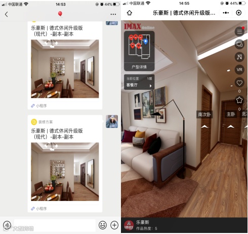 IMAX内有乐豪斯体系样板间,可一键套用,根据房间属性,自动匹配样板间,匹配内容包括地板、墙面、家具、装饰品等。