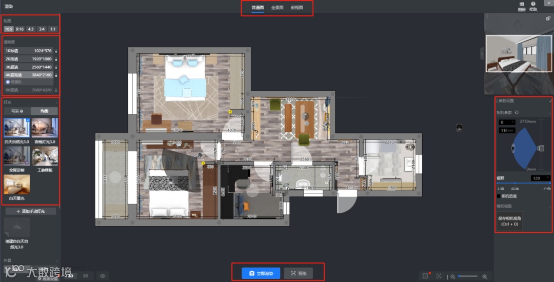 1)照片级渲染模式、720度全景图渲染、俯视图渲染