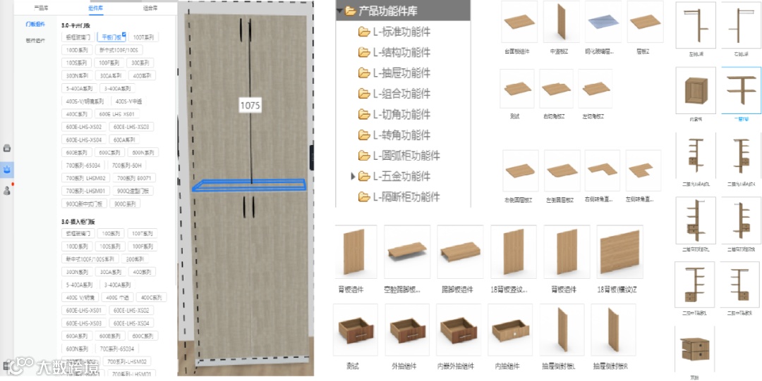 3)板件级设计,利用框架可拖放层板/中竖板/抽盒/组合L架/等组件进行柜内结构设计