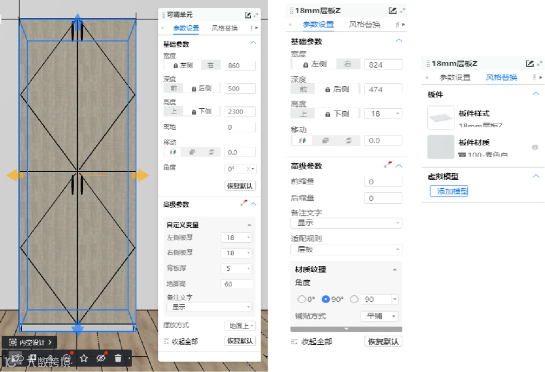 组件模式可用,板件拼接的设计方式,层板可增减与前后缩进、位置可调,组件可替换调整参数,同一款式下内部结构千变万化,不会因为板件不可调整造成非标。