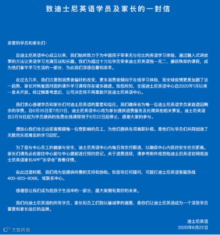 6月22日,迪士尼英语中心官方账号突然发布通知表示,全国迪士尼英语中心自2020年1月以来一直未开放。经过慎重考虑后,公司决定将不再重新开放迪士尼英语中心。自6月26日至7月21日,迪士尼英语中心将为家长提供退费服务及处理其他相关事宜。