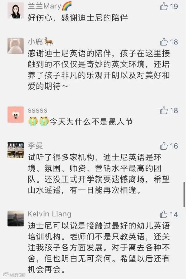 也有家长留言说道,“试听了很多家机构,迪士尼英语是环境、氛围、师资、营销水平最高的团队。还没正式开学就要遗憾离场,希望山水遥遥,有一日能再次相逢。”