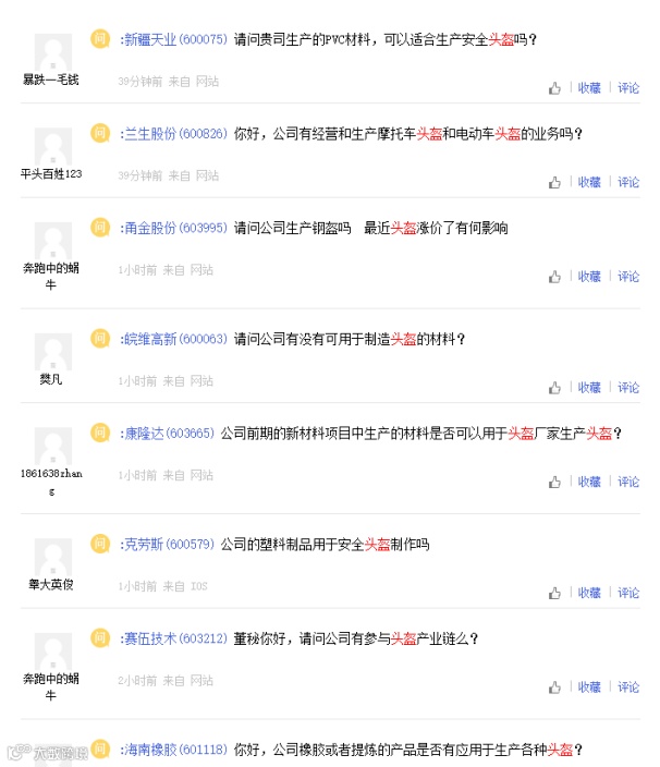 值注意的是,企盾宝发现,最近在A股互动平台上遍布关于“头盔”的问题,一些上市公司收到投资者的问询:“公司是否有制造头盔的材料?”、“你们卖头盔吗?”、“请问贵公司生产的机械机器可以生产头盔吗?”、“公司产品能应用在生产头盔业务上么?”。