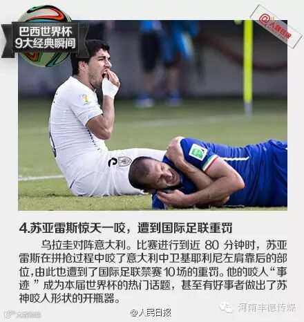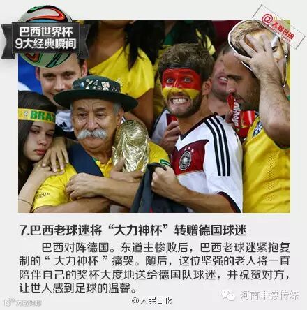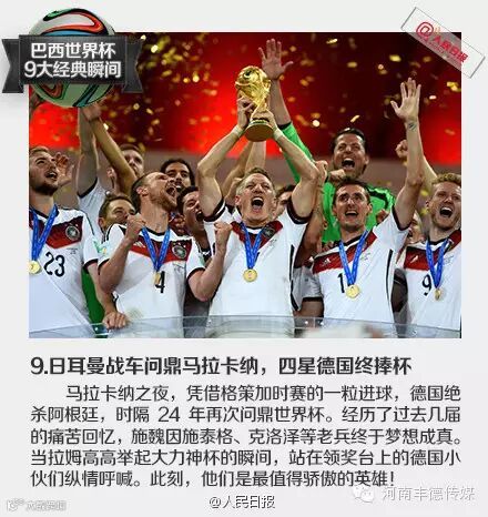 ①揭幕战马塞洛惊天乌龙②范佩西鱼跃冲顶③佩佩怒顶穆勒被罚下④K神后空翻廉颇老矣⑤苏亚雷斯咬人⑥淡定门将调戏梅西⑦内马尔骨裂痛哭惜别⑧巴西老球迷将“大力神杯”转赠德国球迷⑨罗本安慰儿子尽显柔情。那些关于激情、温情与悲情的瞬间,你最难忘的是什么?