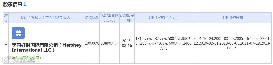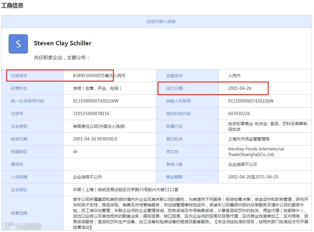 据企盾宝资料显示,好时中国区域的总代理关联公司为好时(中国)投资管理有限公司,该公司成立于2001年4月,注册资本83890万美元,法定代表人为Steven Clay Schiller,由美国好时国际有限公司(Hershey International LLC)全资持股。