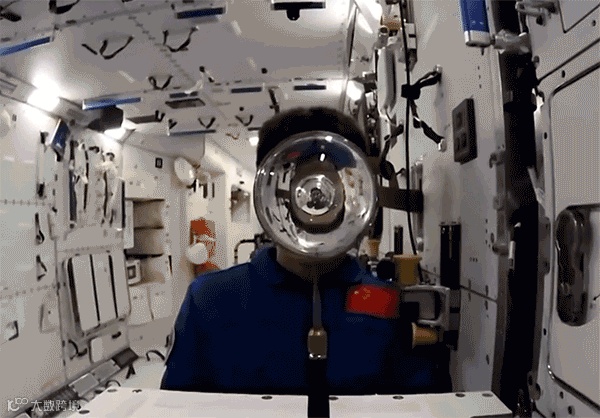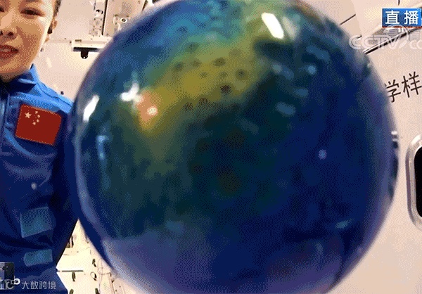 太空泡腾片实验。王亚平将泡腾片放入蓝色水球,水球变成气泡球,像一颗蔚蓝的地球