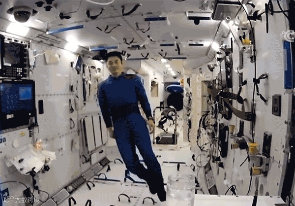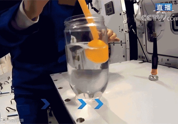 浮力消失实验。在地面上乒乓球放入水里会浮起来,在太空中做同样的实验,乒乓球"浮不浮",答案是不浮!