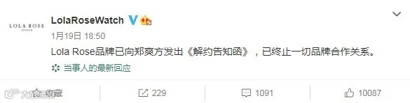 在Prada回应后不久,郑爽代言另一品牌Lola Rose也通过其官博进行发声,表示:Lola Rosa品牌已向郑爽发出《解约告知函》,已终止一切品牌合作关系。