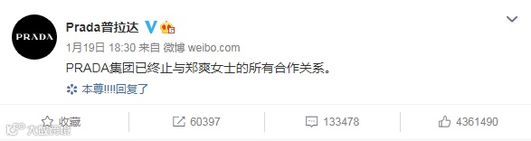 受该事件影响,郑爽代言的品牌Prada在其官博进行回应:PRADA集团终止与郑爽女士的所有合作关系。值得一提的是,这距离Prada确定郑爽为代言人才过去8天。