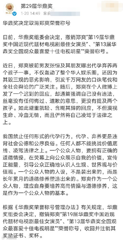 1月20日下午,华鼎奖官博也发文,撤销了郑爽“第19届华鼎奖中国近现代题材电视剧最佳女演员”、“第13届华鼎奖全国观众最喜爱十佳电视明星”“荣誉称号,还要将证书和奖杯一并回收。这在演艺圈,算是首例了。