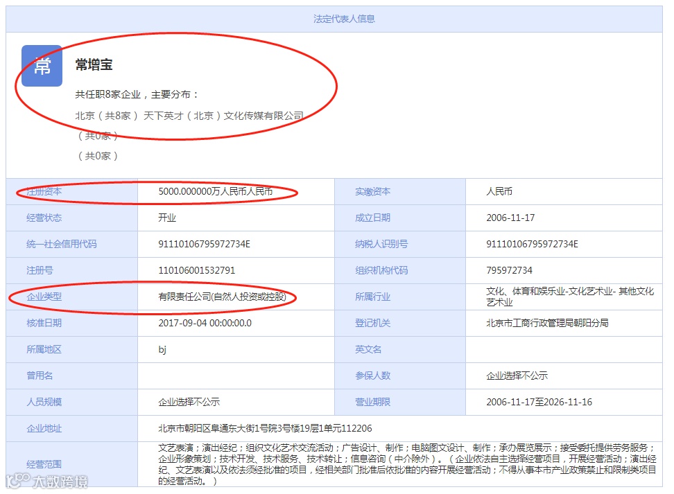 企盾宝资料显示,华鼎奖背后运营公司为天下英才(北京)文化传媒有限公司,法人代表为常增宝,企业类型为有限责任公司(自然人投资或控股),企业注册资本为5000万人民币。公司的关联公众号与网站名称都是华鼎奖。