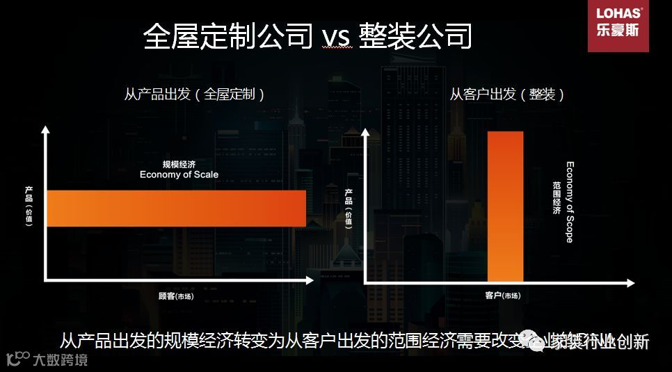 “全屋定制做不了整装,整装没有全屋定制”这是我对目前整装和全屋定制企业现状的描述。整装的趋势让全屋定制企业现在很焦虑,开始涉足整装,但是因为是产品公司基因的问题,他们一直做的是规模经济,很难切入整装这个范围经济市场。做整装的如果不懂产品也很难整合全屋定制,因此才造成了目前的现状。