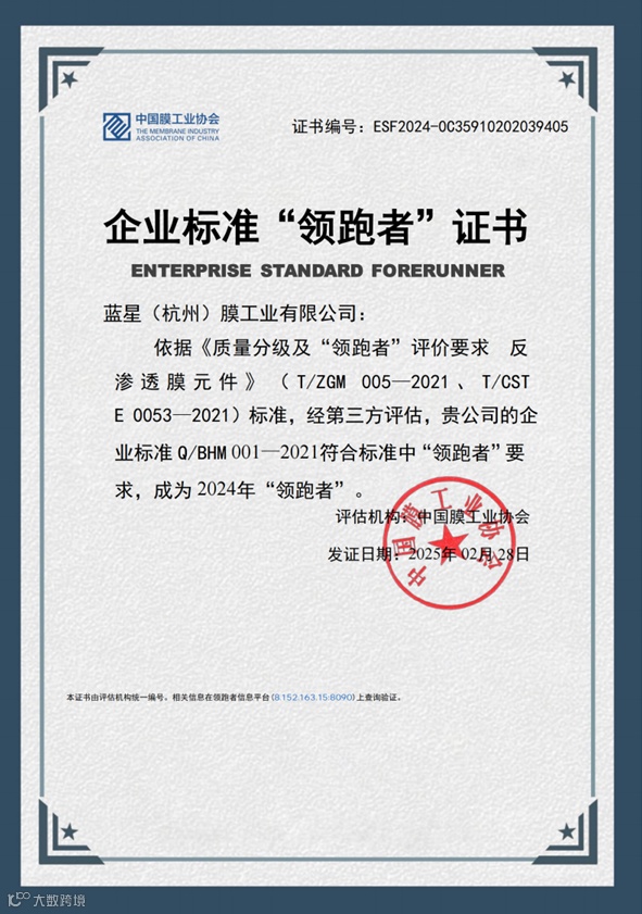 企业反渗透膜标准获评2024年膜行业“领跑者”,以高标准推动产业高质量发展。