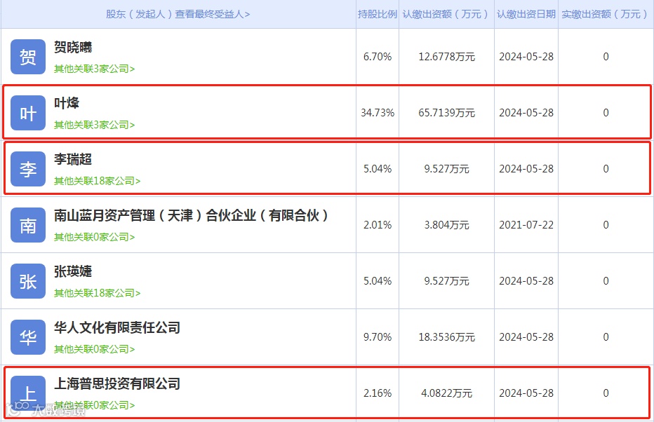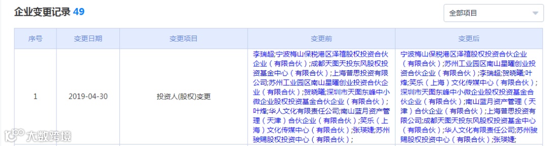 根据企盾宝所显示的信息来看,笑果文化大股东为叶烽,持股比例占到34.73%,李瑞超(李诞)和王思聪持有的上海普思投资有限公司各自分别仅持有5.04%和2.16%的股份,其中李瑞超(李诞)为2016年1月新增投资人(股权),上海普思投资有限公司为2016年9月22日新增投资人(股权)。